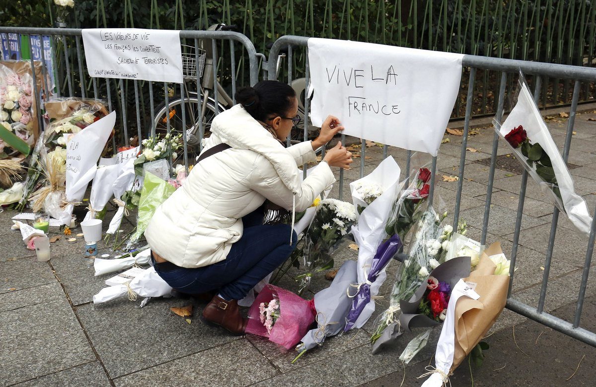 Κεριά, λουλούδια και σημειώματα για τα θύματα των επιθέσεων στο Παρίσι.