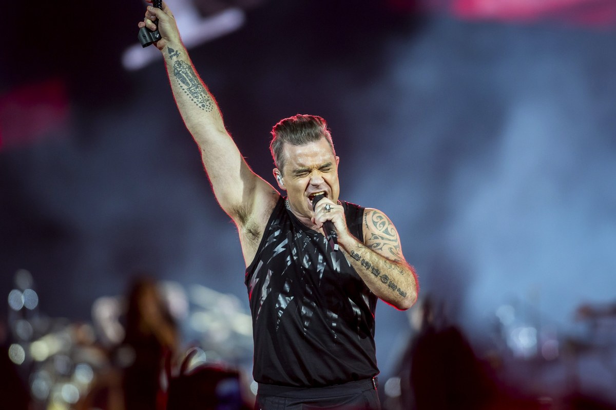 epa06158696 British pop star Robbie Williams performs during his concert at Groupama Arena stadium in Budapest, Hungary, 23 August 2017. It is the Hungarian stop of his 'The Heavy Entertainment Show' stadium tour. EPA/Balazs Mohai To be used only over the course of 14 days from shoot day, for editorial purposes only HUNGARY OUT EDITORIAL USE ONLY