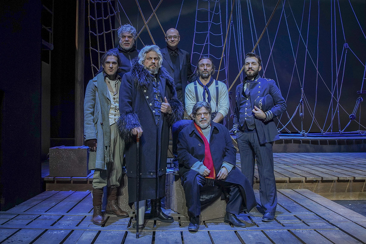 Ήταν μια ανεμοδαρμένη μέρα η χτεσινή, με το χιονόβροχο να μαστιγώνει όλους εμάς που φτάναμε στο Christmas Theater στο Γαλάτσι. Έμοιαζε απόλυτα ταιριαστή με την εικόνα του φαλαινοθηρικού Πίκουοντ μέσα στη μανιασμένη θάλασσα και τη βροχή. Στη συνέντευξη τύπου με αφορμή τις παραστάσεις του έργου Moby Dick – The Musical που ξεκινούν σε λίγες μέρες, μάς υποδέχτηκε ο δημιουργός του μιούζικαλ, Δημήτρης Παπαδημητρίου και ο σκηνοθέτης Γιάννης Κακλέας, ο οποίος παρουσίασε όλους τους συντελεστές και τους ερμηνευτές, μέσα από το εξαιρετικά φωτισμένο σκηνικό του φαλαινοθηρικού Πίκουοντ. Και ήταν όλοι ενθουσιασμένοι και έτοιμοι «να σαλπάρουν» δύο χρόνια μετά το πρώτο ανέβασμα – που διεκόπη λόγω των υγειονομικών συνθηκών.
