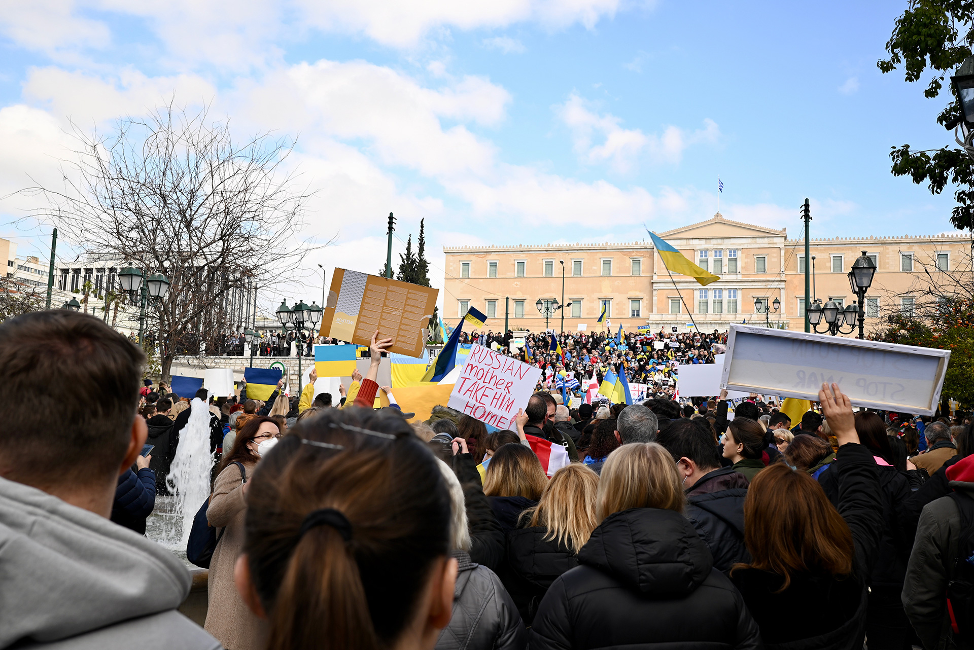 Συγκέντρωση αλληλεγγύης στον ουκρανικό λαό πραγματοποιήθηκε το μεσημέρι της Κυριακής. To κάλεσμα ήταν για τις 2 το μεσημέρι στην Πλατεία Συντάγματος. Η βροχή απλώς καθυστέρησε λίγο την προσέλευση του κόσμου. Γύρω στις 15:00 η πλατεία ήταν γεμάτη γαλαζοκίτρινες σημαίες. Ουκρανοί και Ουκρανές που ζουν στην Ελλάδα αγκαλιάζονταν και ρωτούσαν ο ένας για τους συγγενείς του άλλου. Ήταν ανήσυχοι, συγκινημένοι και πολύ θυμωμένοι. Εμείς προσπαθούσαμε απλά να καταλάβουμε πώς μπορεί να νιώθουν αυτοί οι άνθρωποι, που ναι μεν βρίσκονται σε ασφαλές μέρος, αλλά καρδιοχτυπούν για τους συγγενείς και τους φίλους τους.
