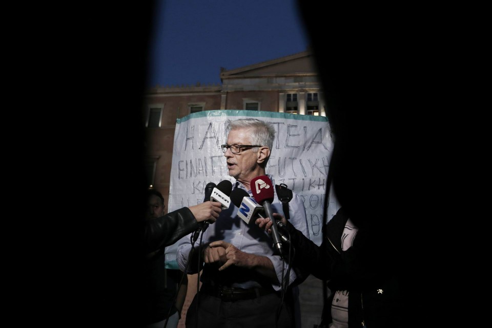 Αρίστος Δοξιάδης. Συγκέντρωση διαμαρτυρίας έξω από τη Βουλή, για τις αλλαγές στην Παιδεία, από την Επιτροπή Πρωτοβουλίας "Παιδεία 2015" , κατά την διάρκεια της ψήφισης του νομοσχεδίου στη Βουλή, το βράδυ της Τρίτης 12 Μαΐου 2015