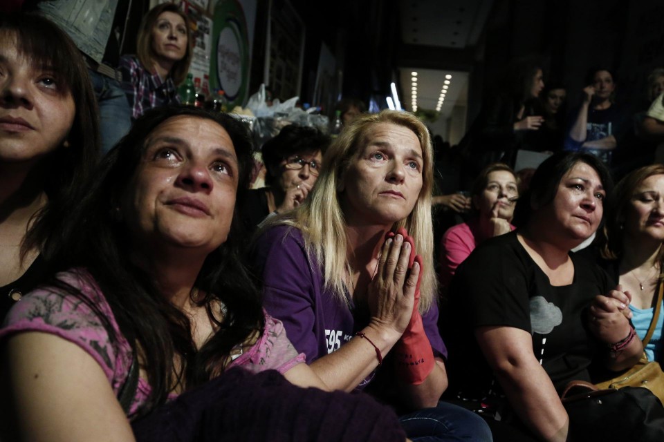 Οι καθαρίστριες του υπουργείου Οικονομικών γιορτάζουν, το βράδυ της Δευτέρας έξω από το υπουργικό κτίριο στην οδό Καραγιώργη Σερβίας, την δικαίωση αλλά και την επαναπρόσληψή τους. Δευτέρα 11 Μαΐου 2015