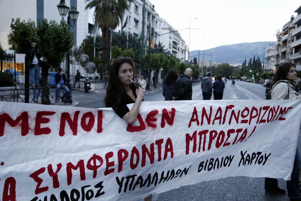 Πορεία διαμαρτυρίας ενάντια στην καταβολή από την Ελλάδα της επόμενης δόσης στο ΔΝΤ. Συμμετείχαν η ΑΔΕΔΥ, η ΑΝΤΑΡΣΥΑ, η Κίνηση για τη Διαγραφή του Χρέους Τώρα, αριστεριστές και μέλη αντιεξουσιαστικών οργανώσεων. Οι διαδηλωτές κατέληξαν στα γραφεία της Ευρωπαικής Επιτροπής οπου πέταξαν κόκκινες μπογιές σε ανδρες των ΜΑΤ και στην εισοδο των γραφείων. Δευτέρα 11 Μαΐου 2015