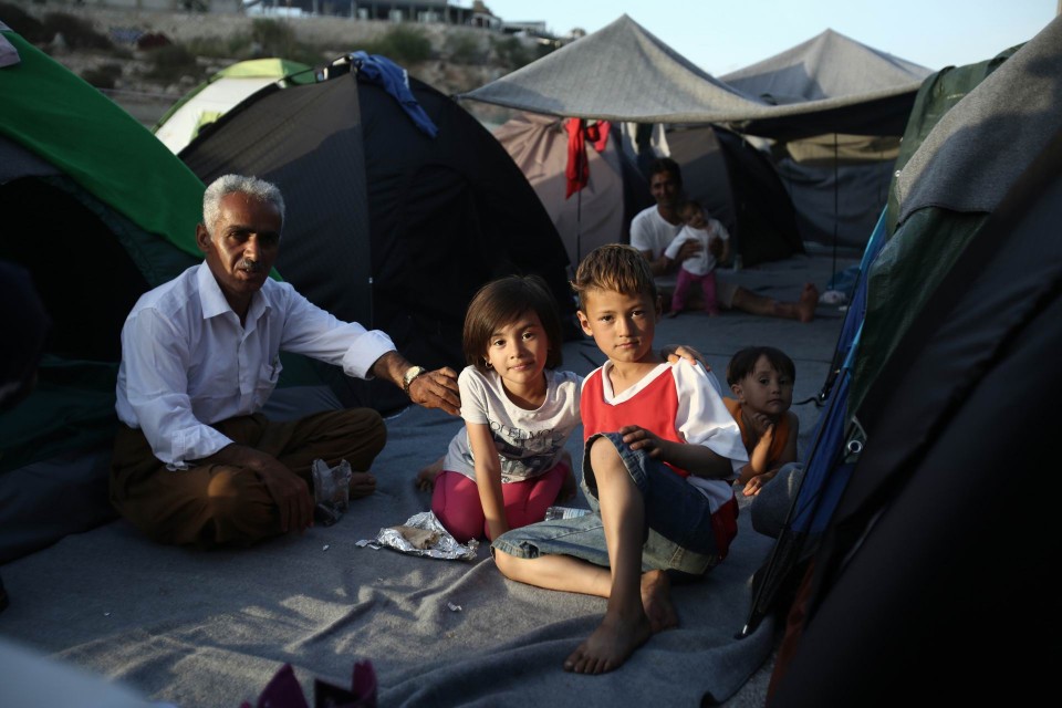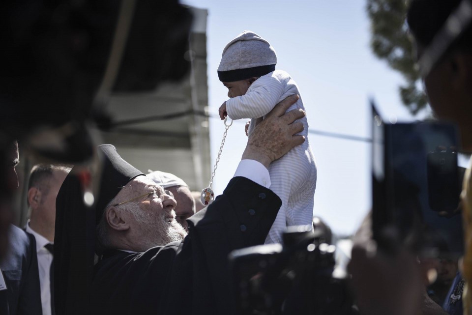 Ο Οικουμενικός Πατριάρχης Βαρθολομαίος κρατά στα χέρια του μωρό προσφύγων. Επίσκεψη Προκαθημένων των Εκκλησιών Ρώμης, Κωνσταντινούπολης και Αθήνας στην Λέσβο. Σάββατο, 16 Απριλίου 2016.