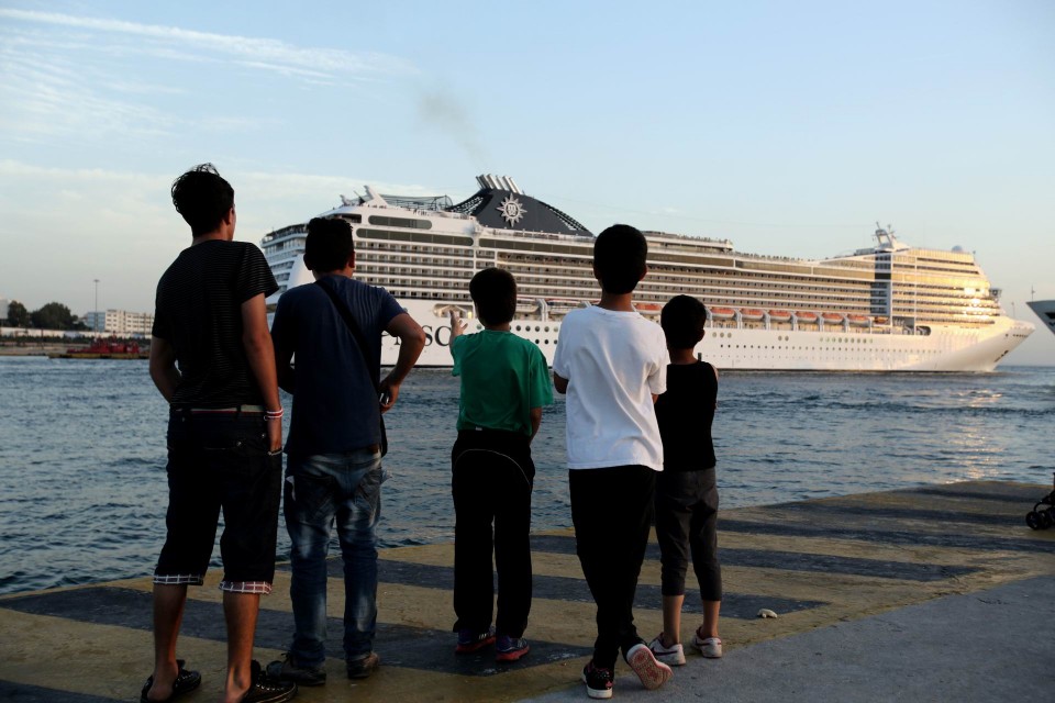 Προσφυγόπουλα, που έχουν βρει κατάλυμα στην πέτρινη αποθήκη του Πειραιά, παρατηρούν μεγάλο κρουαζιερόπλοιο που κατέφθασε στο λιμάνι. Τετάρτη, 20 Απριλίου 2016.