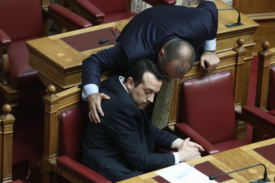 Ο υπουργός Επικρατείας Νίκος Παππάς συνομιλεί με τον βουλευτή των ΑΝ.ΕΛ. Δημήτρη Καμμένο. Κατά την διάρκεια της προ ημερησίας διατάξεως συζήτησης στην Βουλή, για την ασφάλεια και το προσφυγικό. Η συζήτηση έγινε σε επίπεδο πολιτικών αρχηγών. Αθήνα, Τετάρτη 20 Απριλίου 2016.
