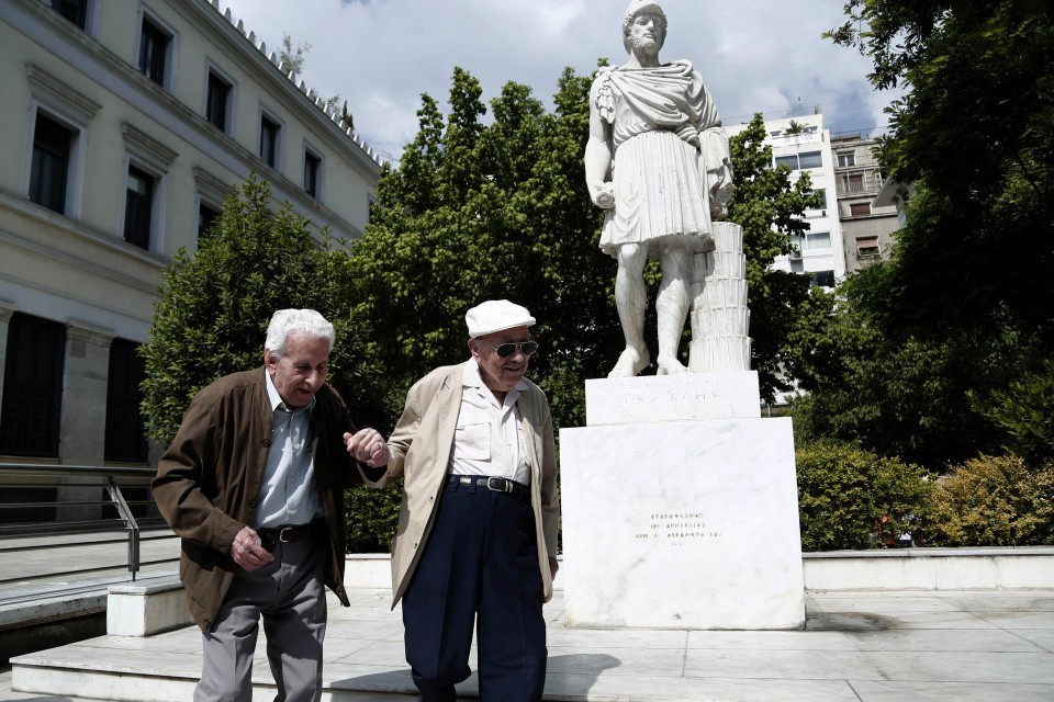 Συνταξιούχοι μπροστά απο το αγαλμα του Περικλή. Συλλαλητήριο στην πλατεία Κοτζιά και πορεία στο υπουργείο Υγείας απο οργανώσεις συνταξιούχων, που διαμαρτύρονται για τη λιτότητα, τις περικοπές συντάξεων, και την κατάργηση της δωρεάν υγείας. Τετάρτη 20 Μαΐου 2015